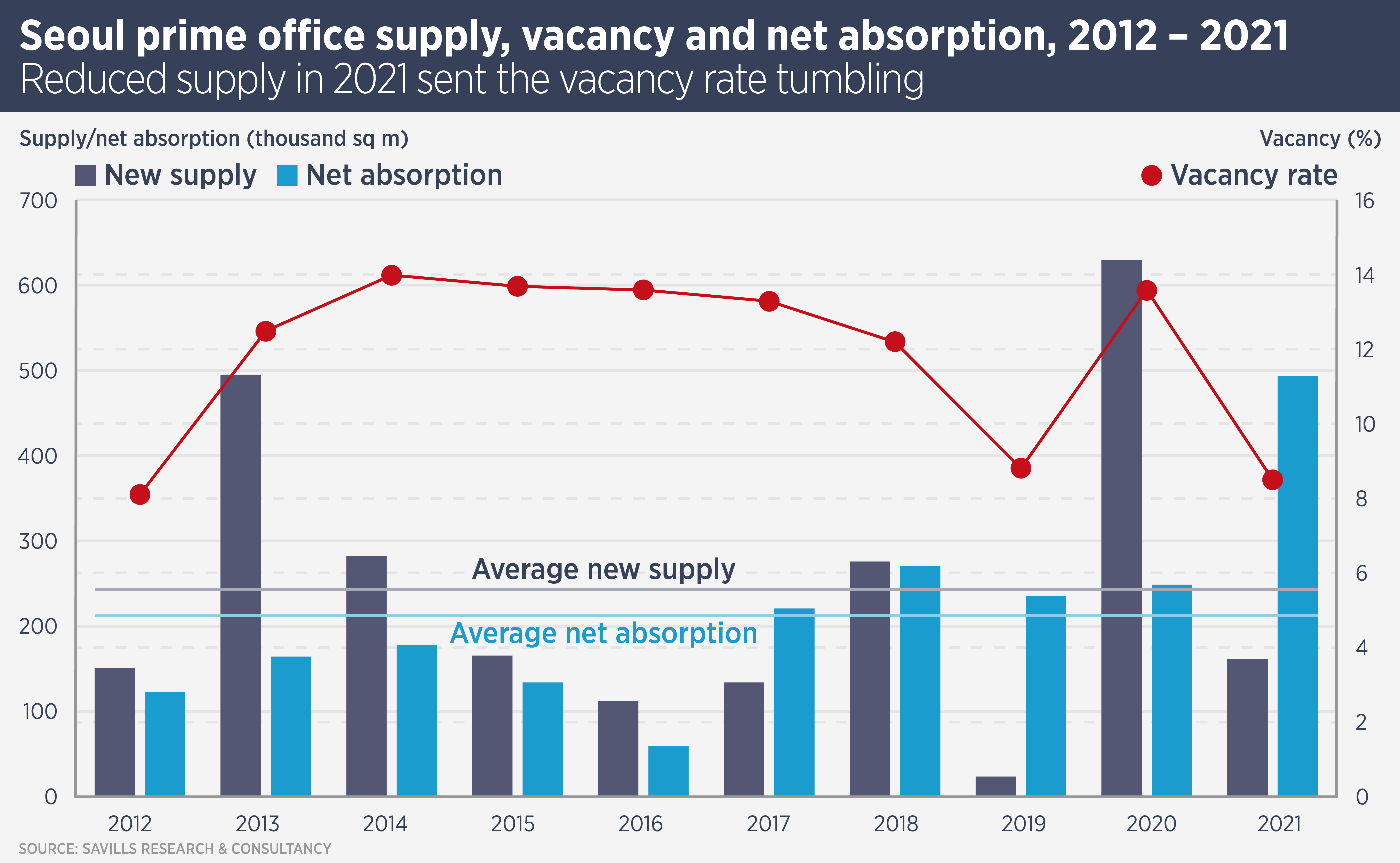 Lower supply of new office space means the Seoul office market is set to shift in favour of landlords. No new prime space will be delivered this year and over 2022-2024, prime office supply will be only one third of the 10 year average. “Net absorption hit a 10 year high in 2021 and leasing demand is expected to remain strong, reducing the vacancy rate to a 10-year low,” says Hong. Tenant demand is coming from IT, fintech and e-commerce companies.