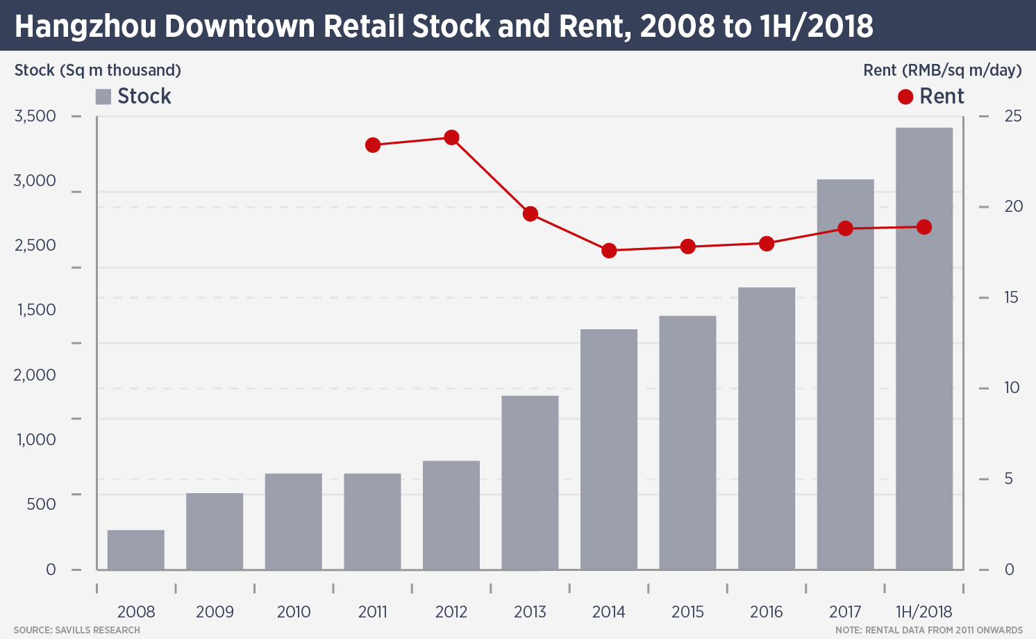However the retail market has seen a surge in supply over the past few years, mainly outside those prime areas. Total gross floor area added over the past three years was 1.5 million sq m, of which only one-fifth was located in prime areas.