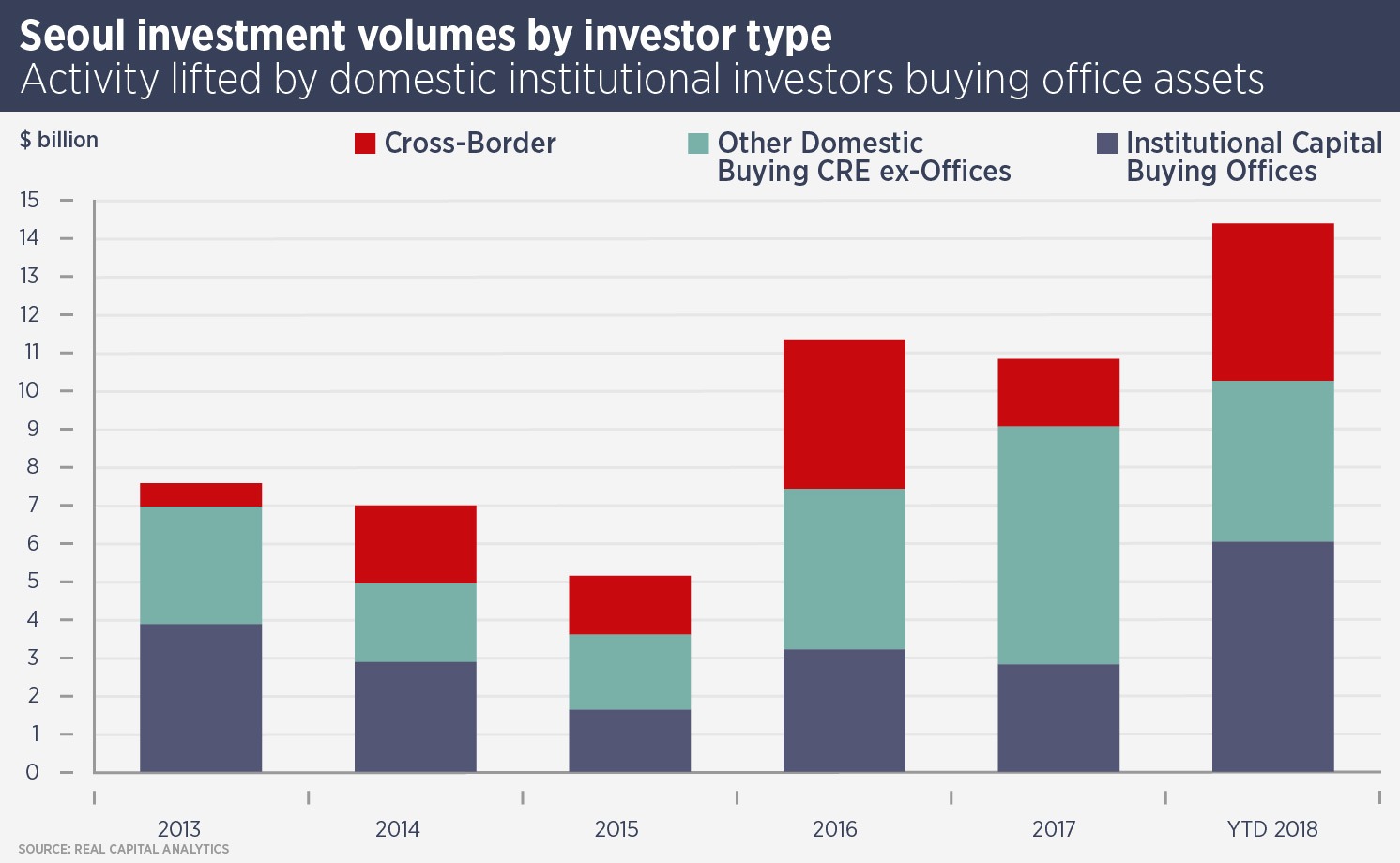 Commercial real estate transaction volumes in Seoul rose 79% to more than $14bn in the 12 months to the end of September, Real Capital Analytics data show, driven largely by domestic investors buying offices.