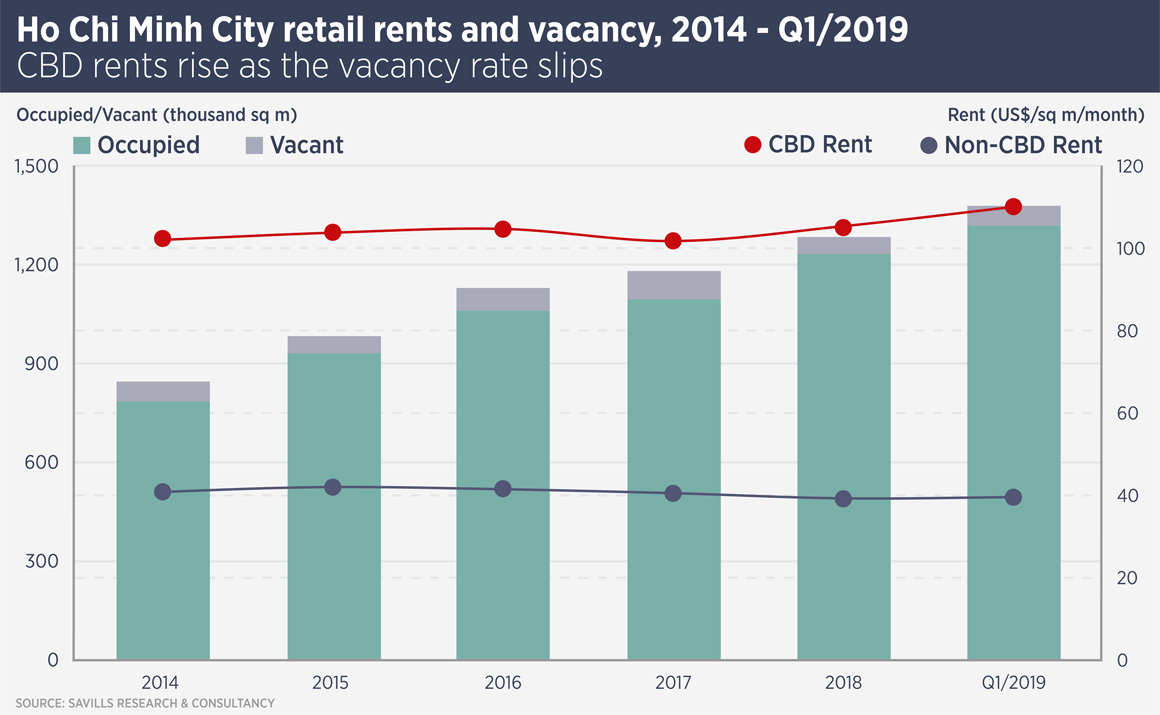 HCMC retail has performed steadily in recent years; supply has risen, but so has take-up and rents. Savills estimates total retail stock to be around 1.4m sq m and this is predicted to increase by one-third by 2021.