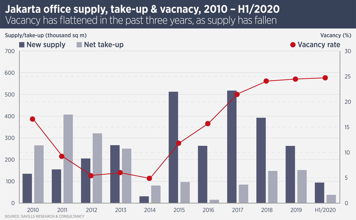 For real estate investors, Jakarta has tended to provide a rocky ride, with periods of high demand followed by over-development and higher vacancy. The office sector saw something of a development boom from 2015, which has created more vacancy as demand was adversely affected by slow economic growth. However, “expansion of e-commerce and tech companies has helped to support demand growth over the past three years, while recent demand has also been driven by co-working space operators,” says Sitorus.