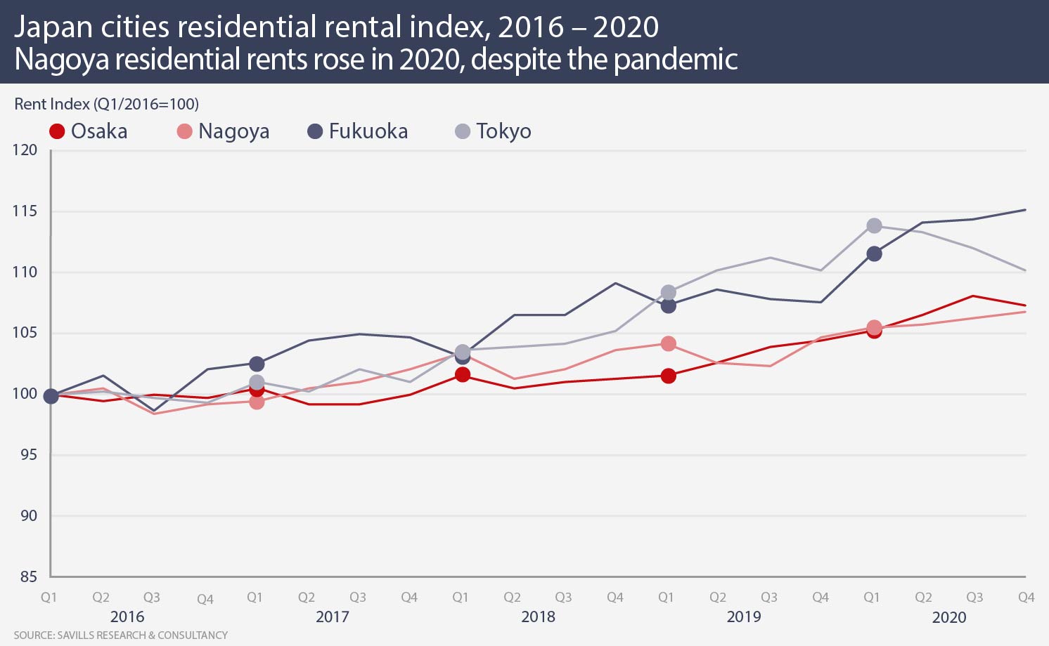 Japan multifamily residential has been one of the favoured sectors for global investors in recent years and cap rate compression in Greater Tokyo has pushed many investors into markets such as Nagoya. However, in 2020, Tokyo accounted for 42% of total residential transaction volumes. Nagoya residential has performed well in recent years, with steady rental growth, largely unaffected by the pandemic.