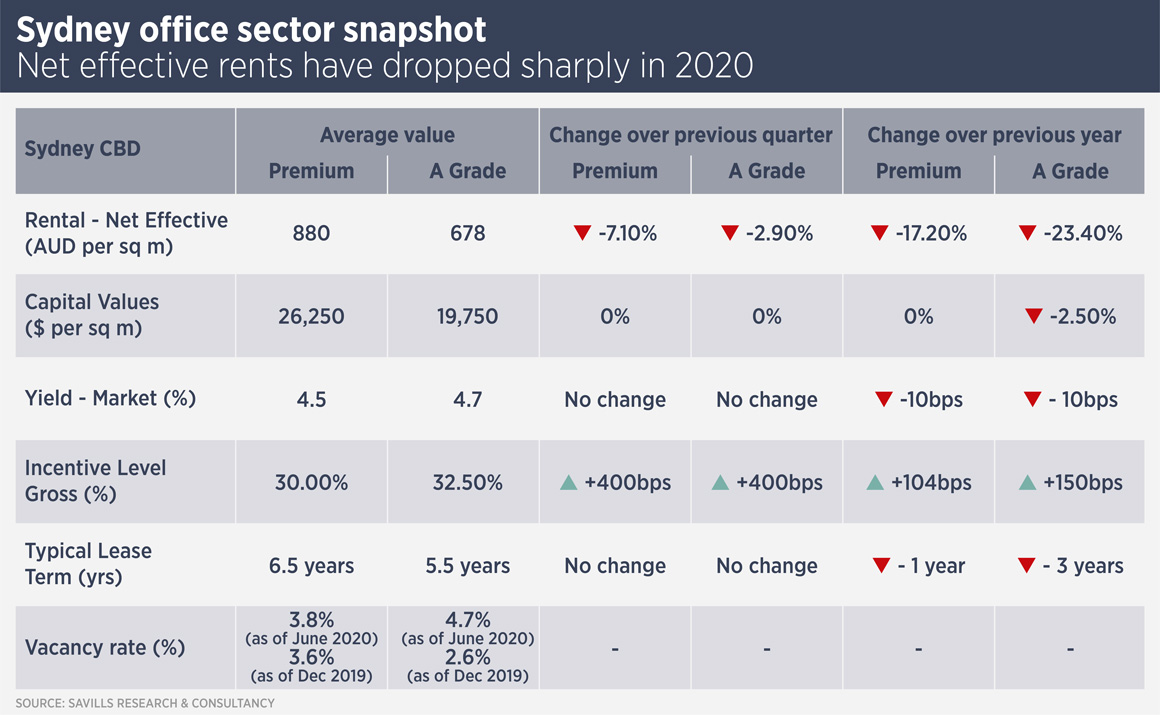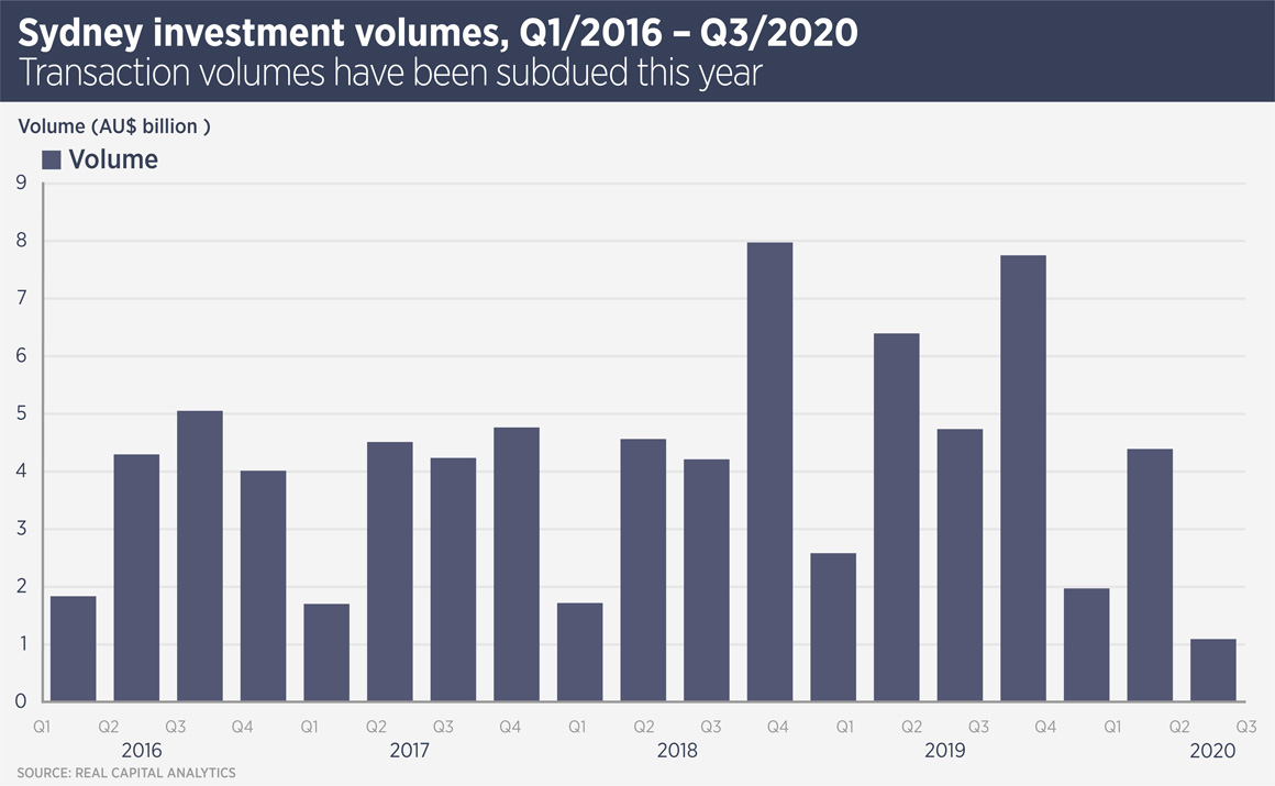 “We have not seen fire sales and valuers have been pretty cautious so far in how they treat assets,” says Ben Azar, national head of cross border investments at Savills Australia. “The big question for potential buyers is: what is your prognosis for the Sydney leasing market?”