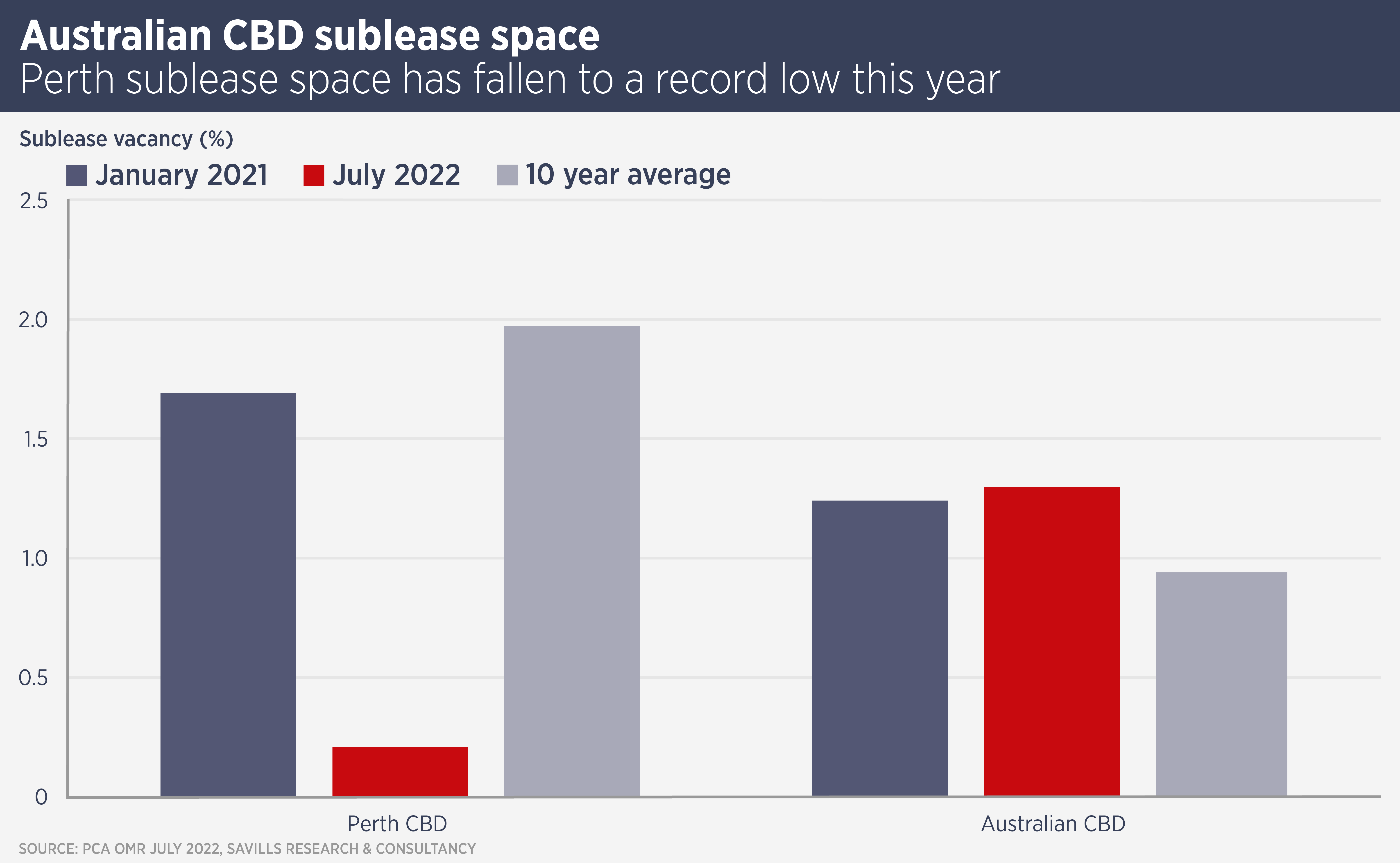 Savills data now show the Perth CBD has the lowest sublease vacancy rate in the country – peaking at 1.7% in Jan 2021 and now down to 0.2%; its lowest level in over 10 years. Tenants have been withdrawing sublease space from the market in the expectation of growth.