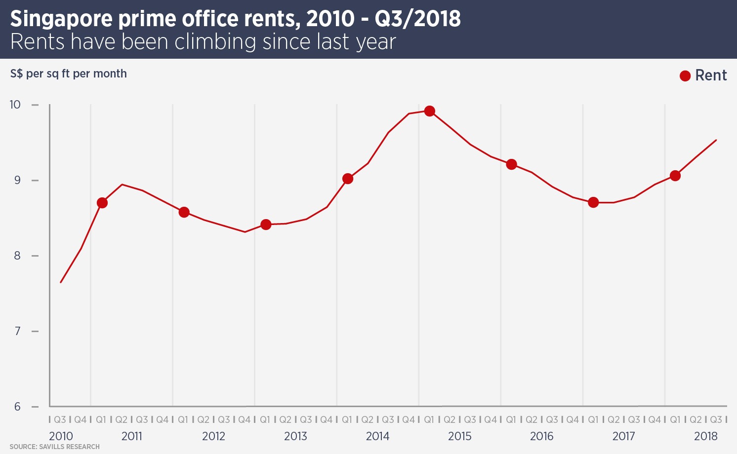 Savills research shows CBD office rents rose 2.5% during the third quarter of this year and have risen 6.6% year-to-date. Alan Cheong, head of research and consultancy at Savills Singapore reckons office rents will rise 10% this year and 8%-10% in 2019.