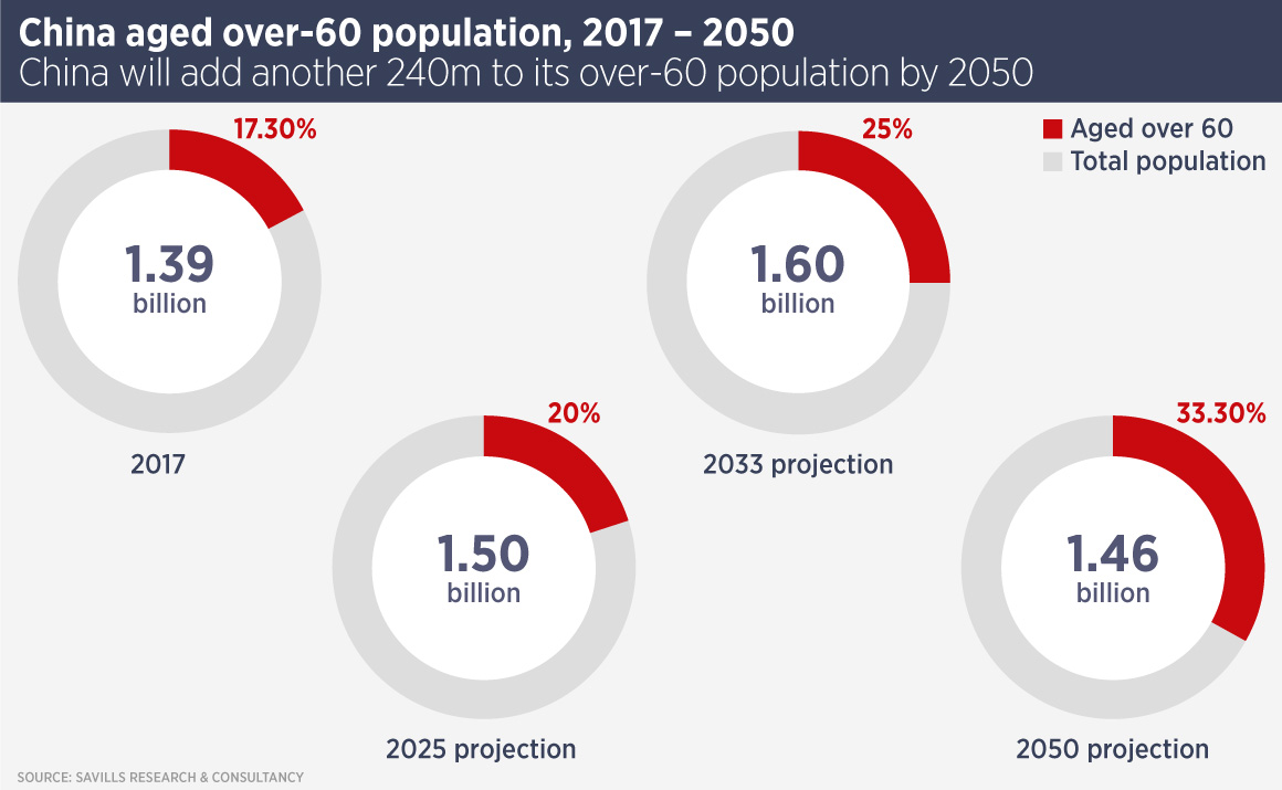 The ageing population and the effect of China’s one-child policy means the tradition of children caring for their parents is no longer viable, as few families are large enough to support elderly parents. Furthermore, urbanisation means more Chinese work in cities far from their parents.