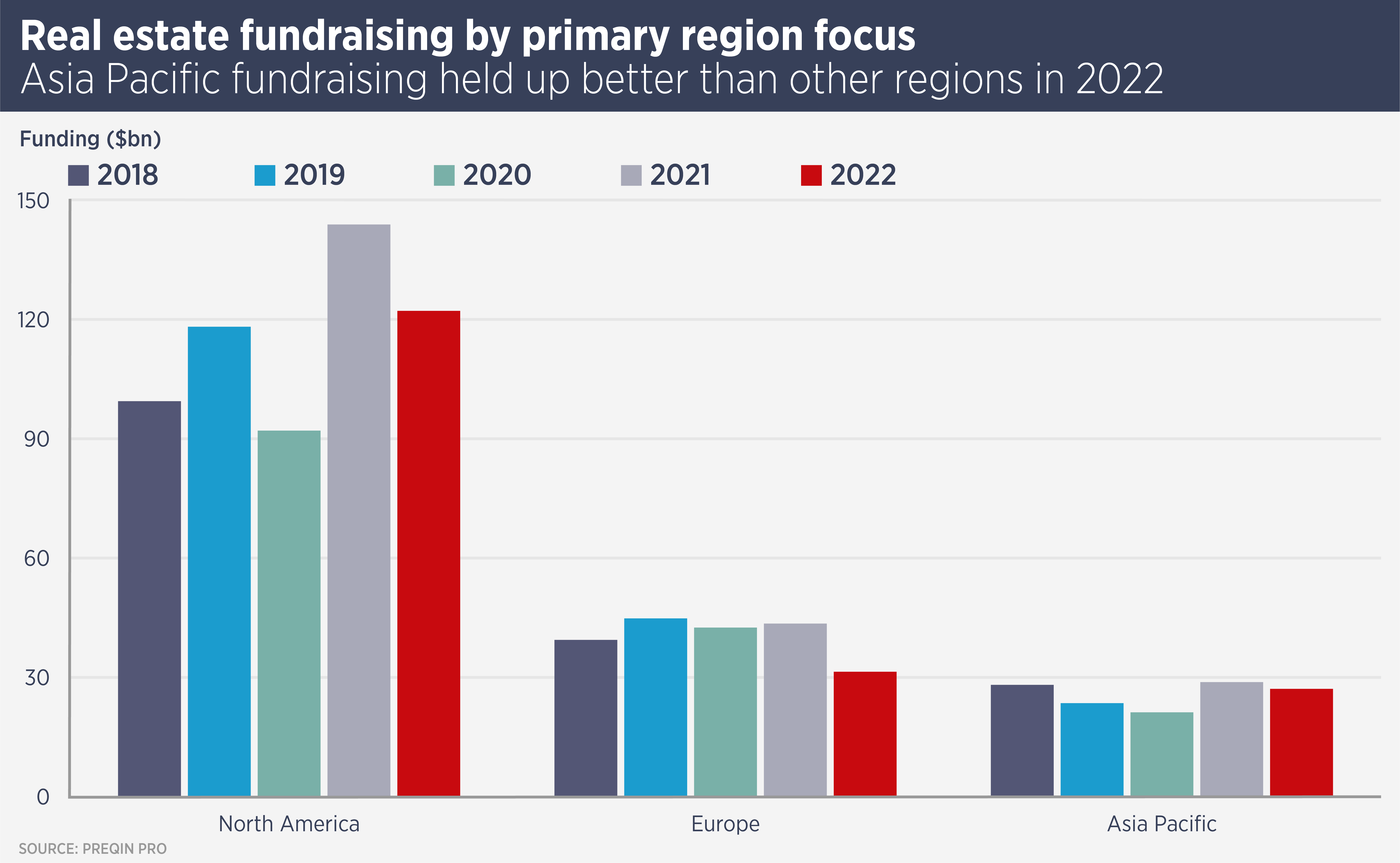 Data from private equity researcher Preqin show that Asia Pacific-focused real estate fund-raising fell 6% in 2022, compared with a drop of 15% for North America and 28% for Europe. Asia Pacific funds also account for a higher-than-average percentage of the global total of capital raised. Preqin suggests this trend is likely to persist.