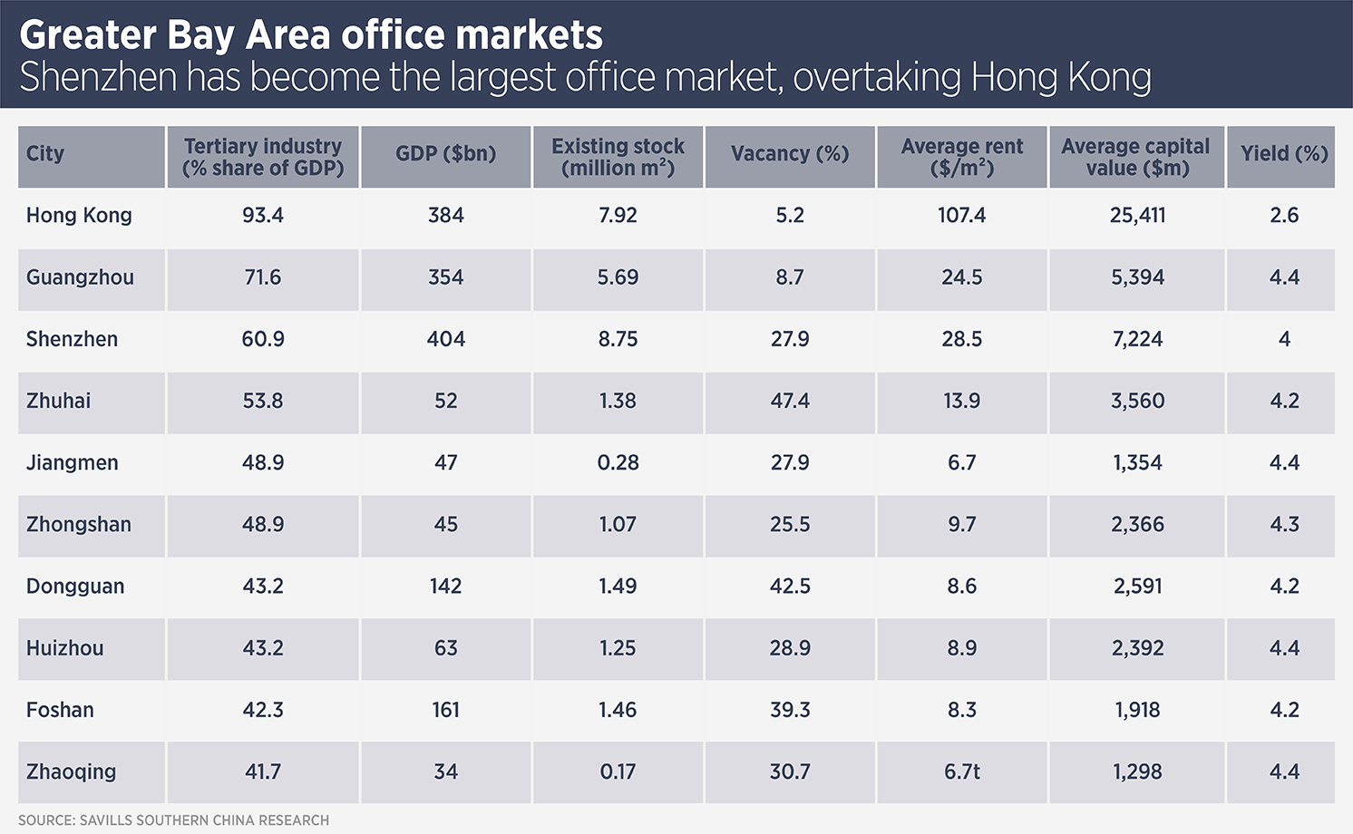 Simon Smith, head of research and consultancy, Savills Asia Pacific, says: “The continued integration of the GBA, moving up the value chain and its large population mean it will soon overtake the Tokyo Bay and New York Bay regions in terms of GDP. This growth will open up substantial opportunities for real estate investors.”