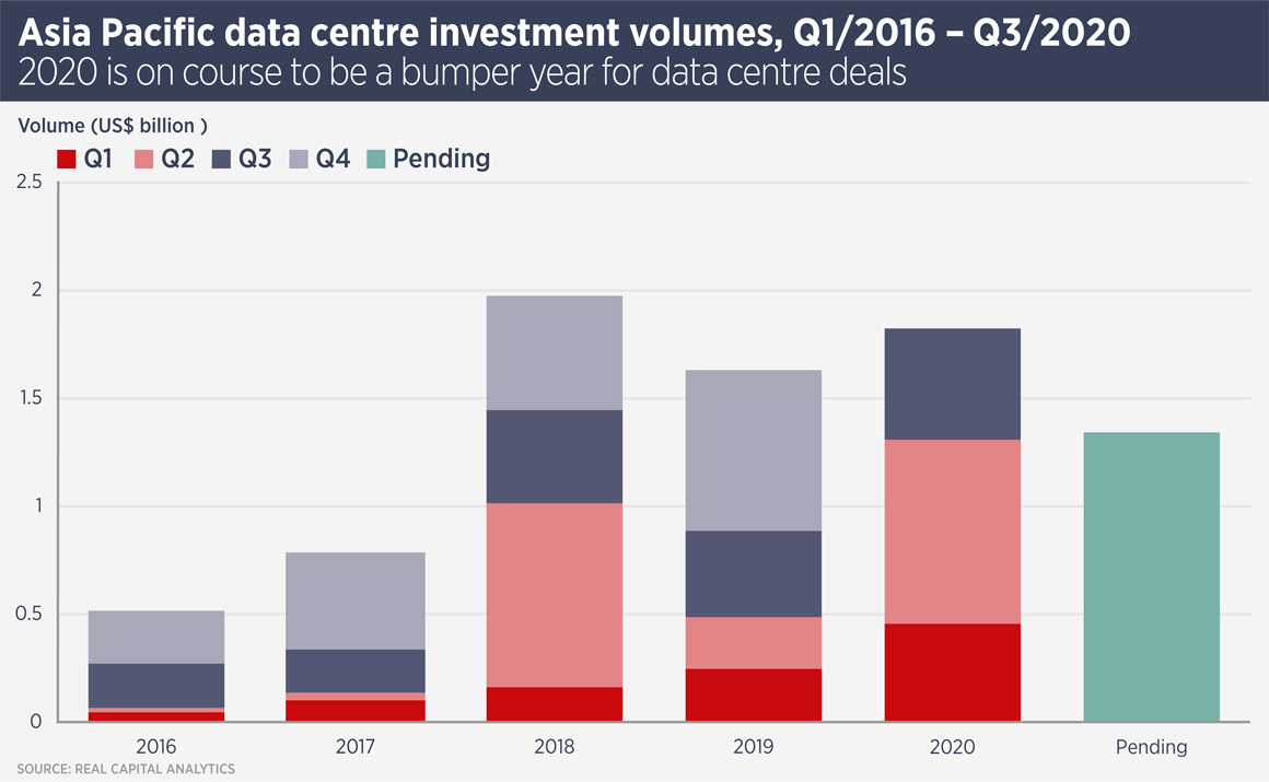 Investors have noticed, with Gaw Capital Partners closing a $1.3bn China data centre fund in September. And in October, Bain Capital-backed data centre operator Chindata raised $540m in an IPO which valued the firm at $4.9bn. Real Capital Analytics data (see below) shows Asia Pacific data centre investment sales are on track to quadruple this year, compared with 2016.