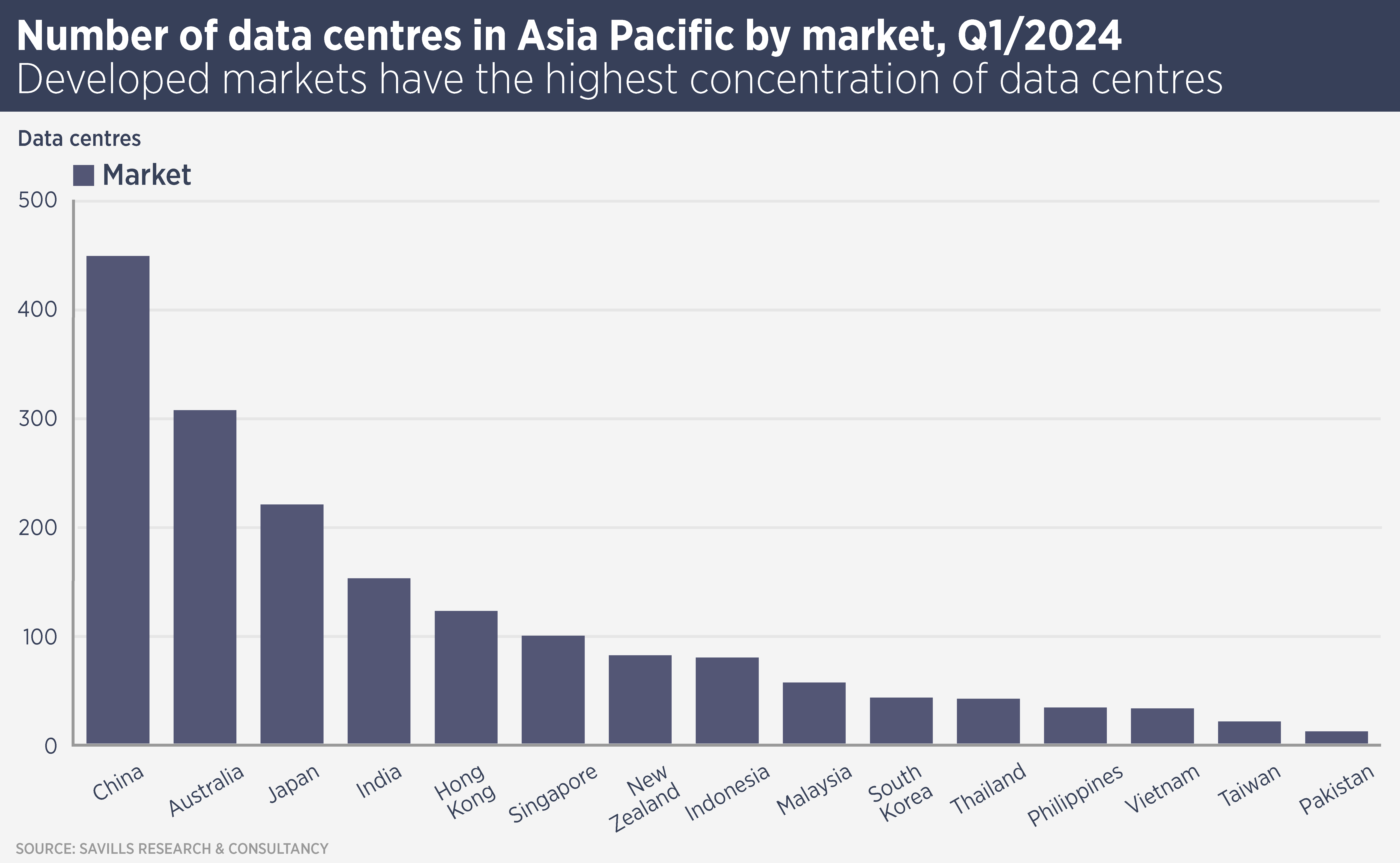 At present, Mainland China has the largest number of data centres (see chart) but smaller developed markets such as Australia, Hong Kong and Singapore have the greatest concentration of sites.