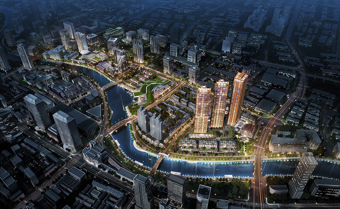 Located at the intersection of Shanghai’s most attractive waterways, OCT Suhe Creek enjoys a 270° view of both the Bund and Lujiazui, taking in Shanghai’s history and bright modernity. The Foster+Partners-designed project also includes art galleries, a Bulgari Hotel and office space, as well as luxury apartments.