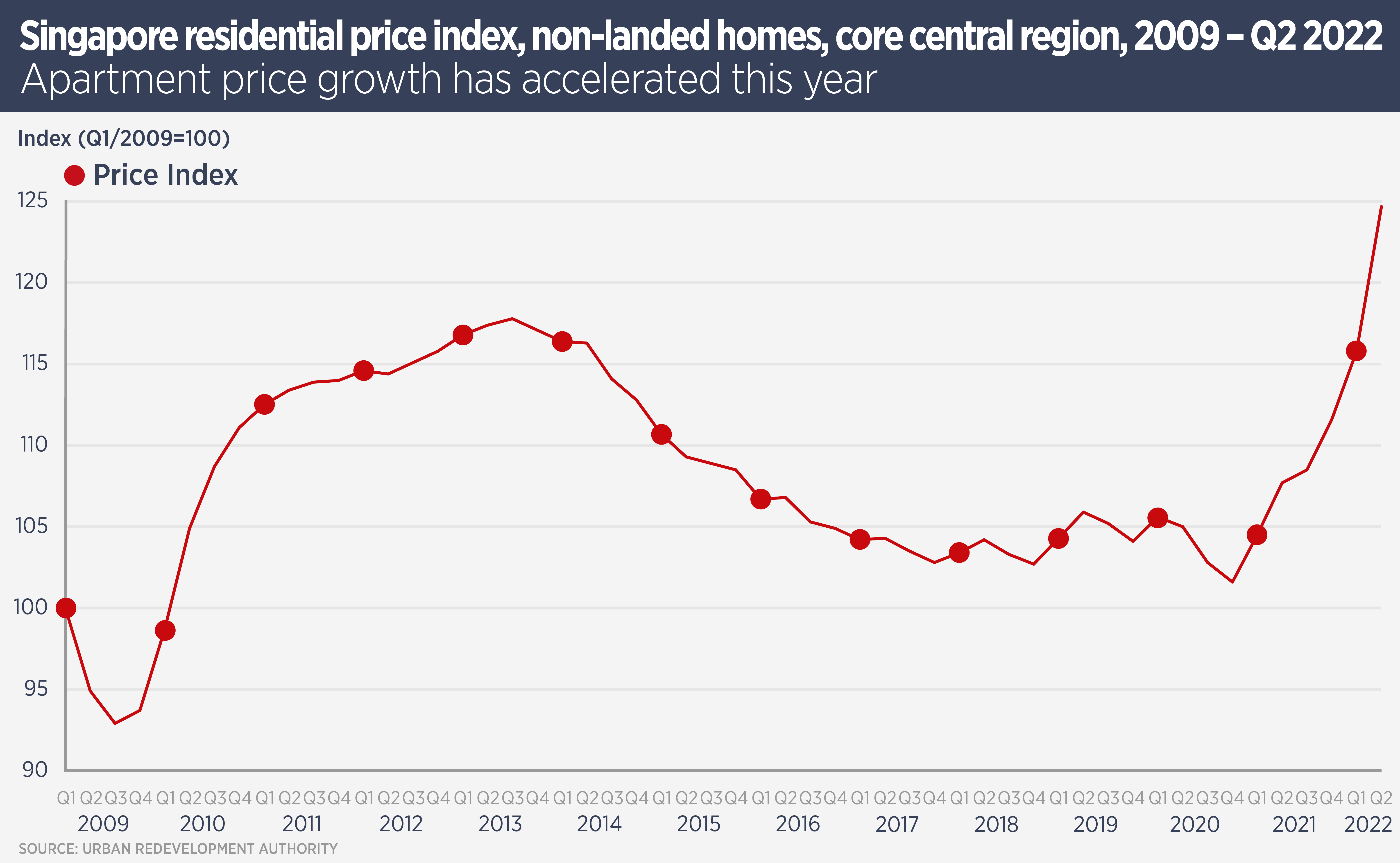 The Urban Redevelopment Authority rental index for all private residential properties surged 6.7% quarter on quarter in Q2 2022, the largest quarterly increase since Q4 2007 when rents increased 6.8%.