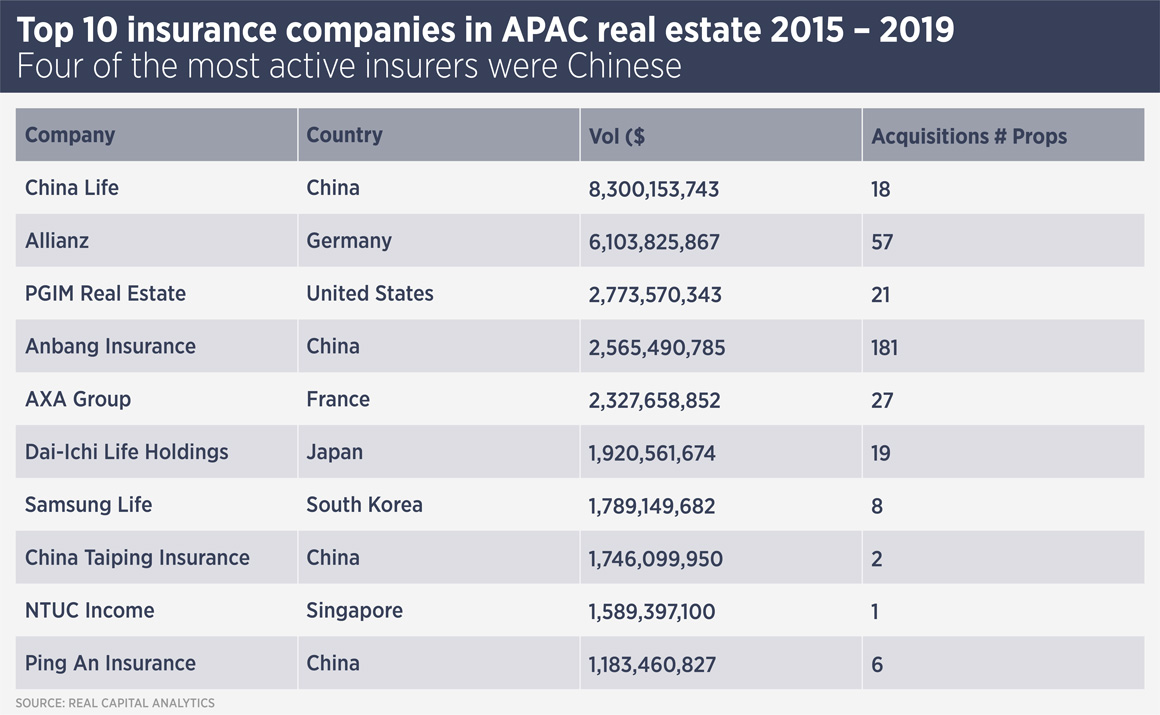 Chinese groups have been amongst the most active Asian insurers ( see table below) but are currently restricted to investing domestically. South Korean insurance companies have invested overseas, while Taiwanese insurers – which dominate their local real estate market – have made little heady due to onerous regulation. “Insurance companies are strictly regulated and understanding their regulatory restrictions is a key to dealing with them,” says Young. “The shorter lease lengths in Asia can also be a barrier to insurers investing in property here.”
