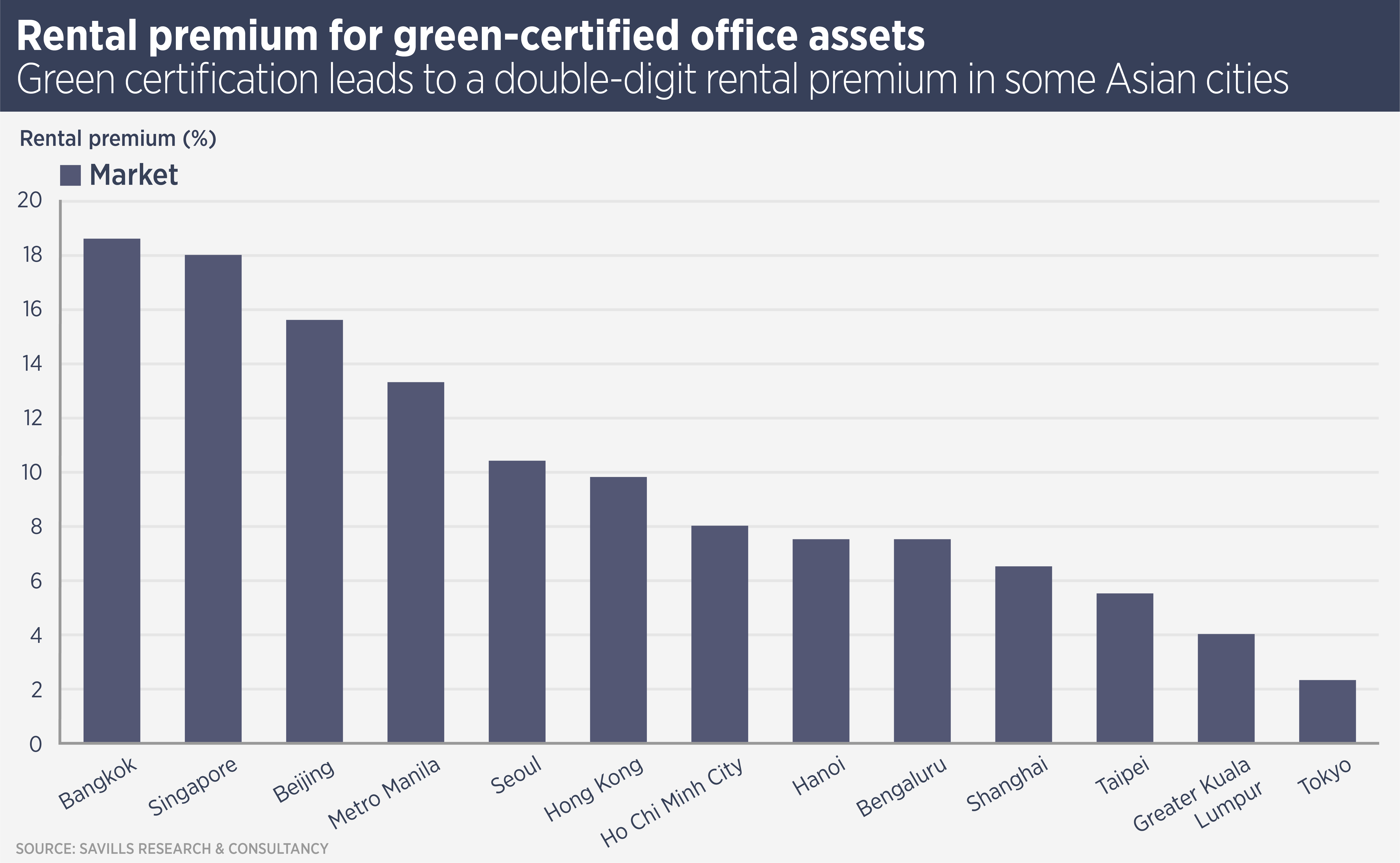 Data from Savills Research & Consultancy seem to show that tenants are prepared to pay higher rents for office properties which have achieved some sort of green certification. The rental premium varies from more than 15% in Singapore and Bangkok to less than 4% in Tokyo.