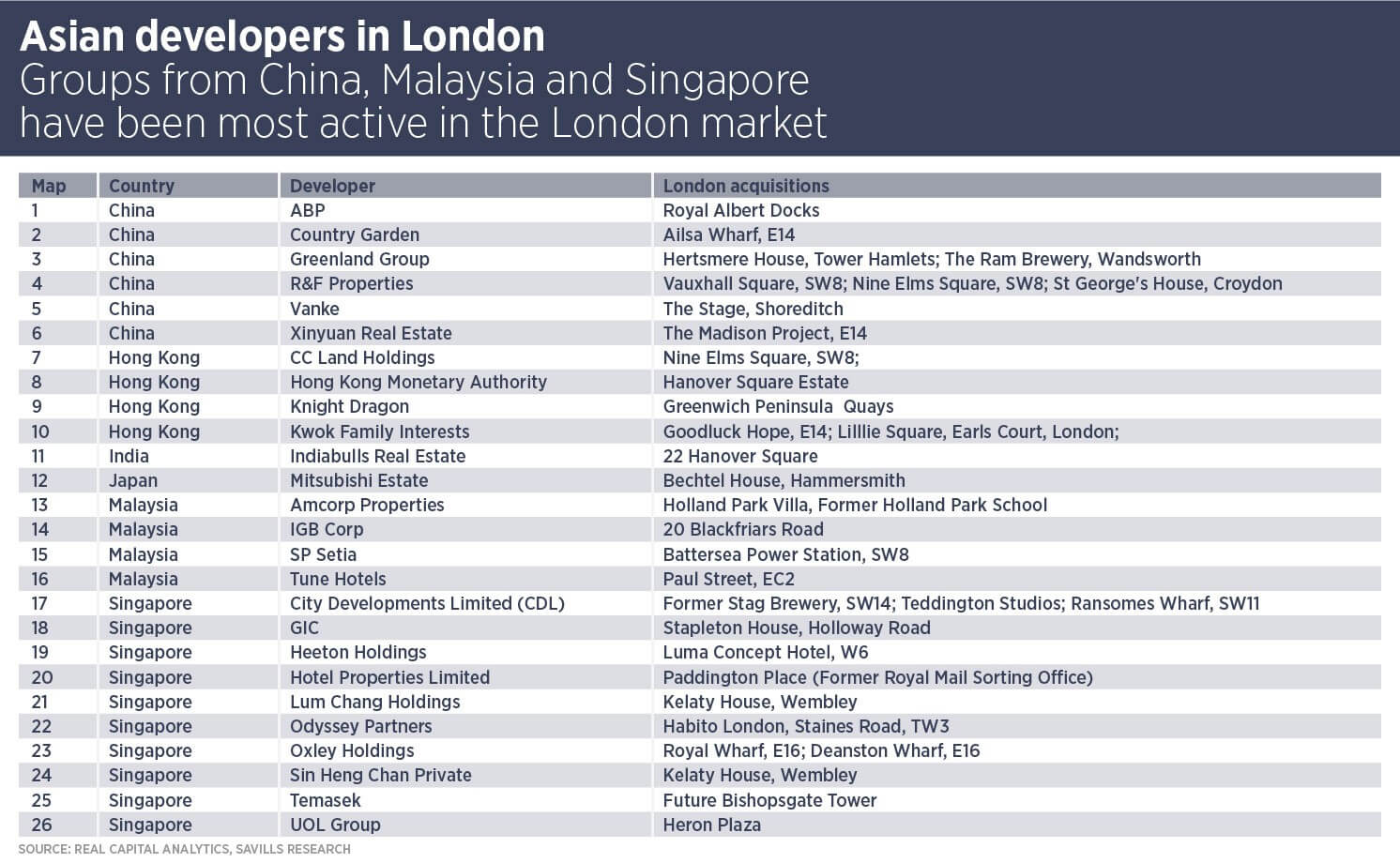 Data from Real Capital Analytics shows that Asian developers have spent more than £2.2bnon London development sites between January 2013 and November 2018.