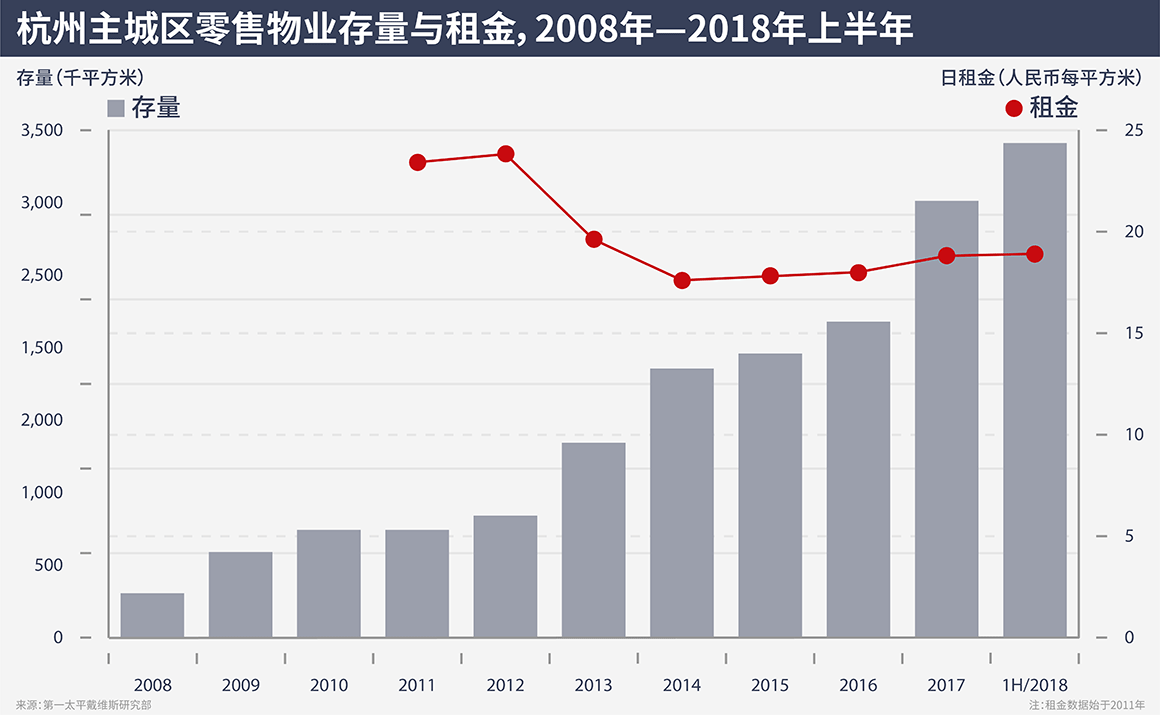 过去三年中,杭州零售市场供应激增,共计新增150万平方米面积,且主要集中在非核心商圈。核心商圈仅占20%左右。