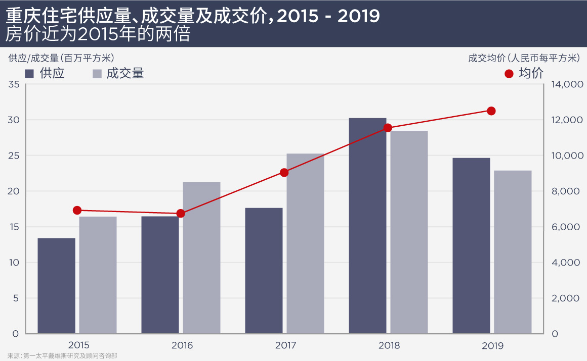 由于中国经济增长放缓、信贷紧缩,房价亦结束此前几年的急速上涨,在2019年趋于平缓。尽管如此,重庆房价依然录得8.6%的年度增幅。重庆主城区新建住宅供应共计2,460万平方米,同比减少18.5%,同期交易面积增加近20%。