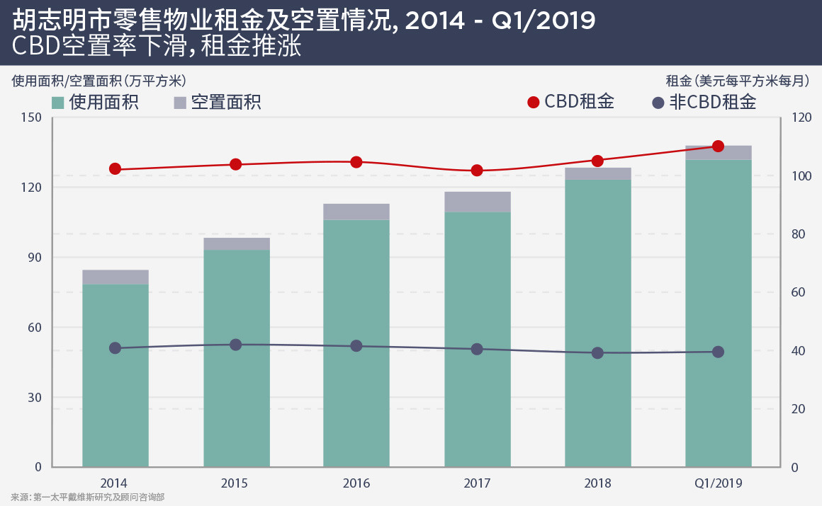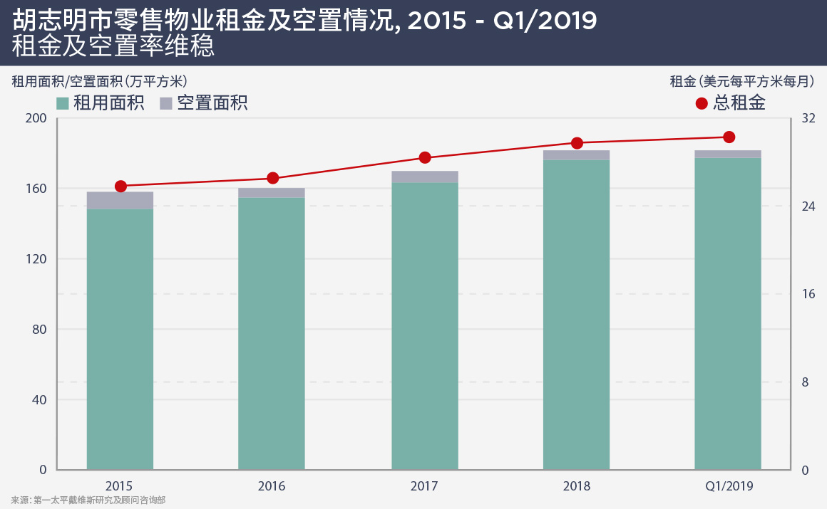 胡志明市零售业近年走势平稳。虽然供应有所增加,但吸纳量和租金也同时改善。 第一太平戴维斯估计全市零售总存量约为140万平方米,预计到2021年将在当前基础上增加三分之一。