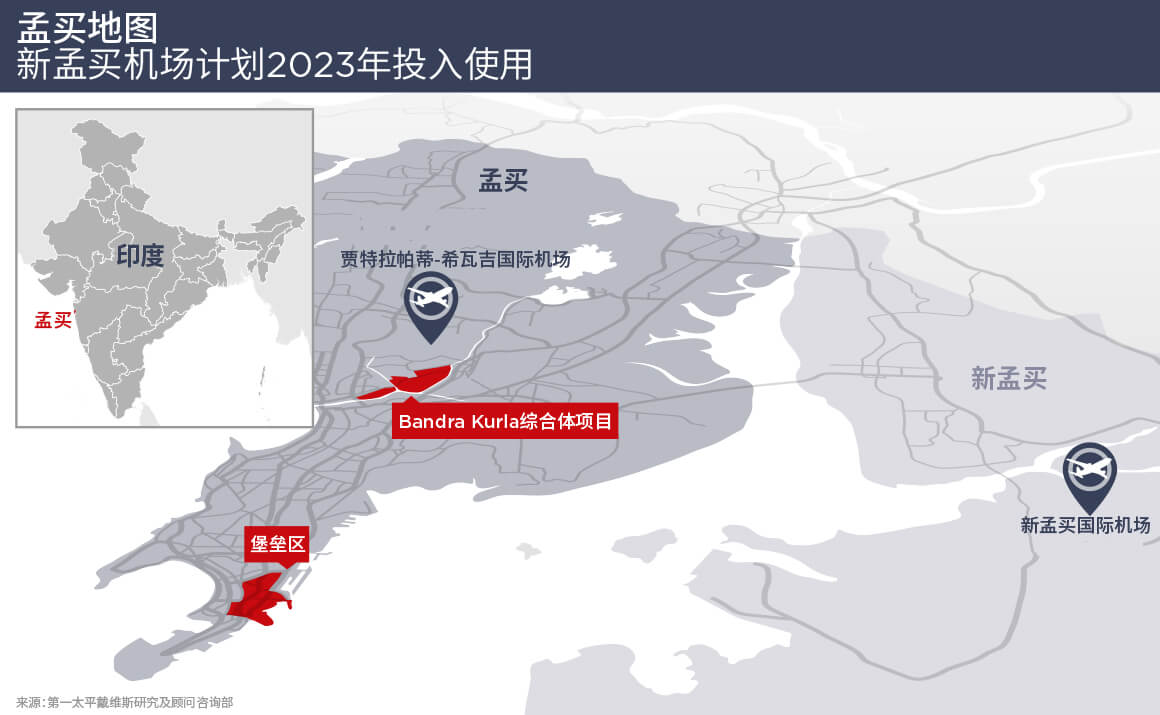 孟买坐落于印度西部马哈拉施特拉邦的一个半岛,历史城区以及原CBD均位于半岛顶端,近代逐年向内陆扩张。新孟买地区已经成为溢出需求的承接区。如今,孟买的主要商业区是Bandra Kurla综合体,靠近孟买国际机场,亦辐射周边居民区。