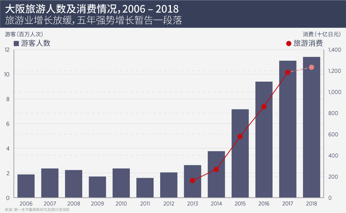 以饮食、购物和单口喜剧而闻名的大阪,是日本旅游市场蓬勃发展的主要受益者,游客人数在2012年至2018年间增加近六倍。虽然大阪在2018年遭受多起自然灾害,但预期经济能够迎来强势复苏。