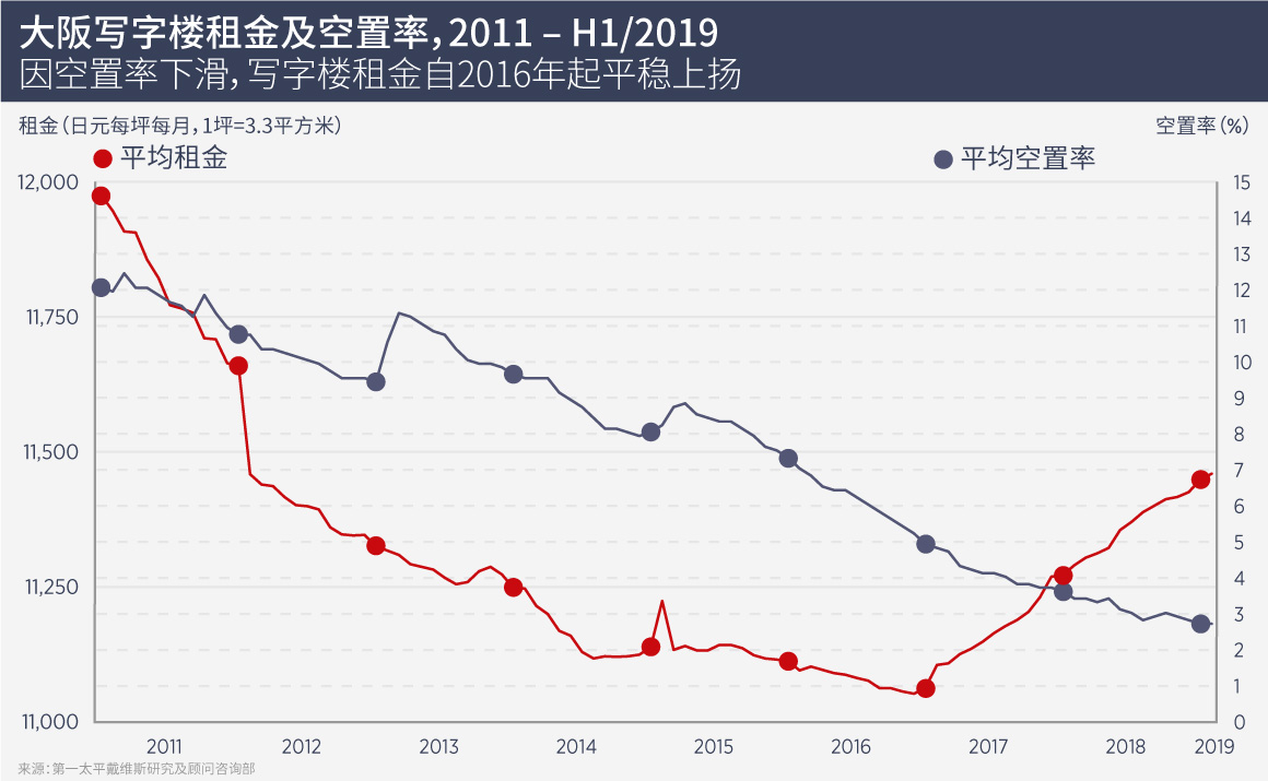 大阪写字楼市场在全球金融危机期间受到重创,但由于数年间新增供应稀缺,写字楼租金迎来强势反弹,尽管仍远低于金融危机前的水平。