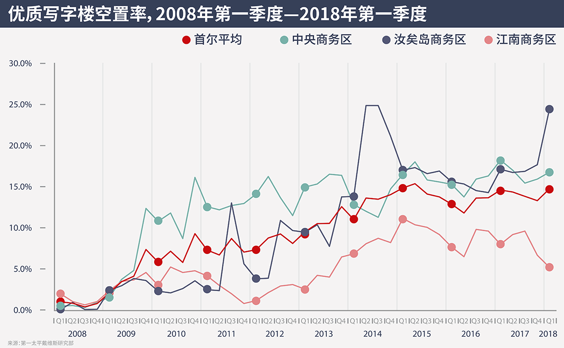 江南是技术及媒体公司集聚地,是首尔的富人区,同时也是首尔最稳定的写字楼板块。由于供应紧缺,空置率仅为4.1%。