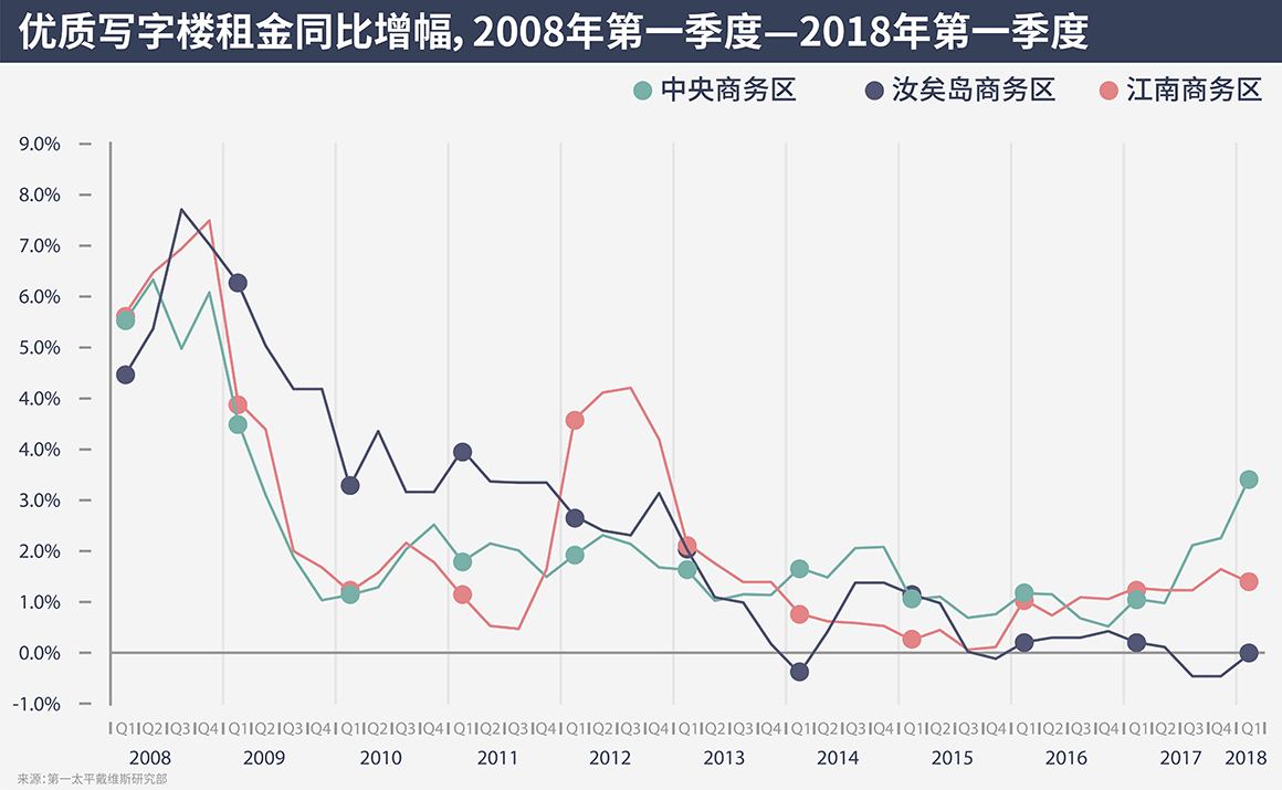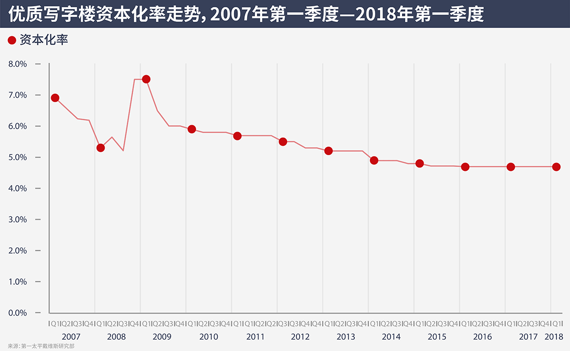 第一太平戴维斯韩国研究部主管JoAnn Hong女士表示:“若采用租金报价,入住率按90%计算,则2018年第一季度优质写字楼平均资本化率为4.7%。如果考虑租户优惠以及实际入住率,实际资本化率应该不到4.7%。