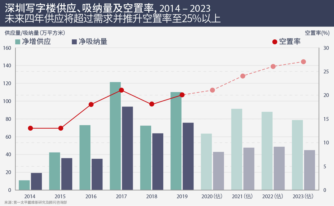 然而从长远来看,深圳与大湾区的联系及其在科技领域的枢纽地位将给写字楼市场带来利好。