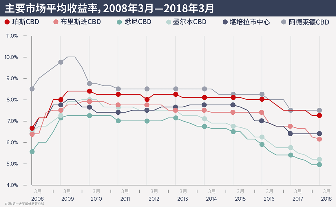 据第一太平戴维斯测算,悉尼CBD与墨尔本的优质写字楼平均收益率分别为4.95%与5.2%,远远低于上轮峰值即2007年水平。墨尔本CBD写字楼均价约为每平方米10,000澳元,而2007年均价刚到6,000澳元。悉尼的写字楼均价逼近每平方米20,000澳元,而2007年才刚刚超过12,000澳元。