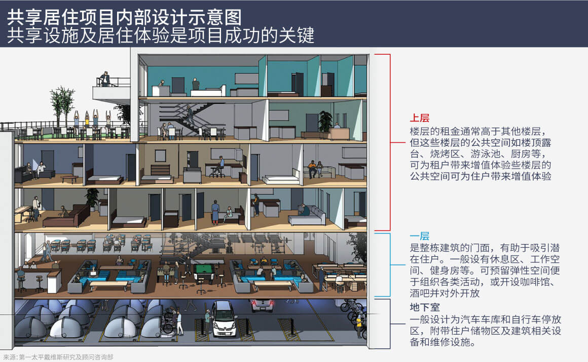 共享居住项目提供的租赁公寓往往小于正常户型,但会包含厨房、影映室、健身房、办公空间等租户公用的空间或设施。运营商还会为租户提供生活及社交服务,例如安排清洁、组织社交活动等。