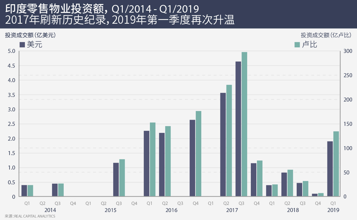 Real Capital Analytics数据显示,过去五年印度零售物业交易大幅增加。印度大选前夕市场趋于平静,但今年第一季度投资兴趣再次升温。