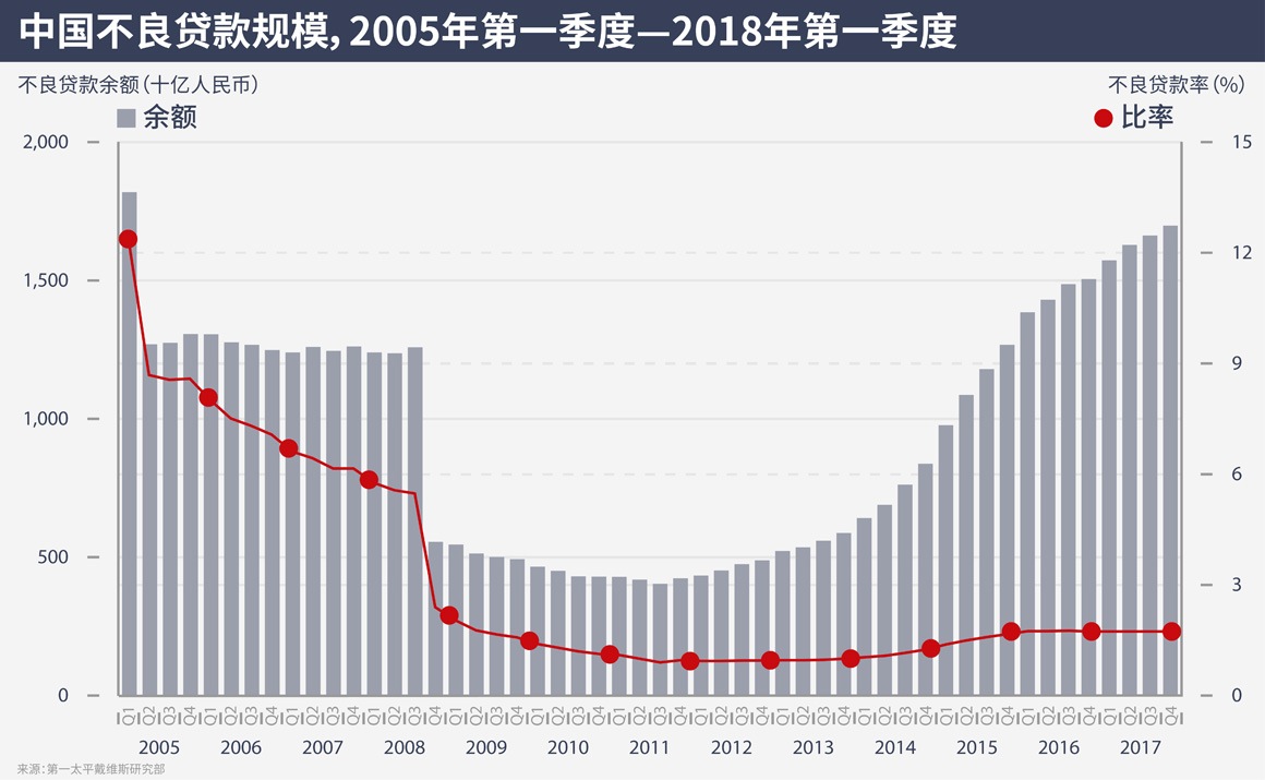 中国银监会数据显示,截至2017年底,商业银行不良贷款余额共计人民币1.7万亿元(约合2,706亿美元),占比1.7%,相当于2012年底余额的三倍有余。但惠誉国际估计,不良贷款实际占比高达20%(人民币19万亿元)。
