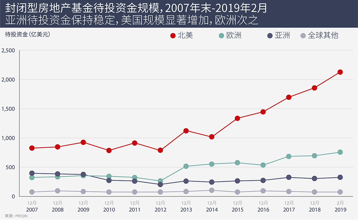 然而Preqin数据显示,亚洲基金的资本积压风险要低于欧洲与北美。截至2018年底,活跃于亚洲市场的房地产基金还有330亿美元的待投资金,较2014年增加了60亿美元。同期,专注于北美市场的基金待投资金从1,020亿美元增至2,130亿美元,翻了一倍有余;欧洲基金待投资金增长35%至760亿美元。