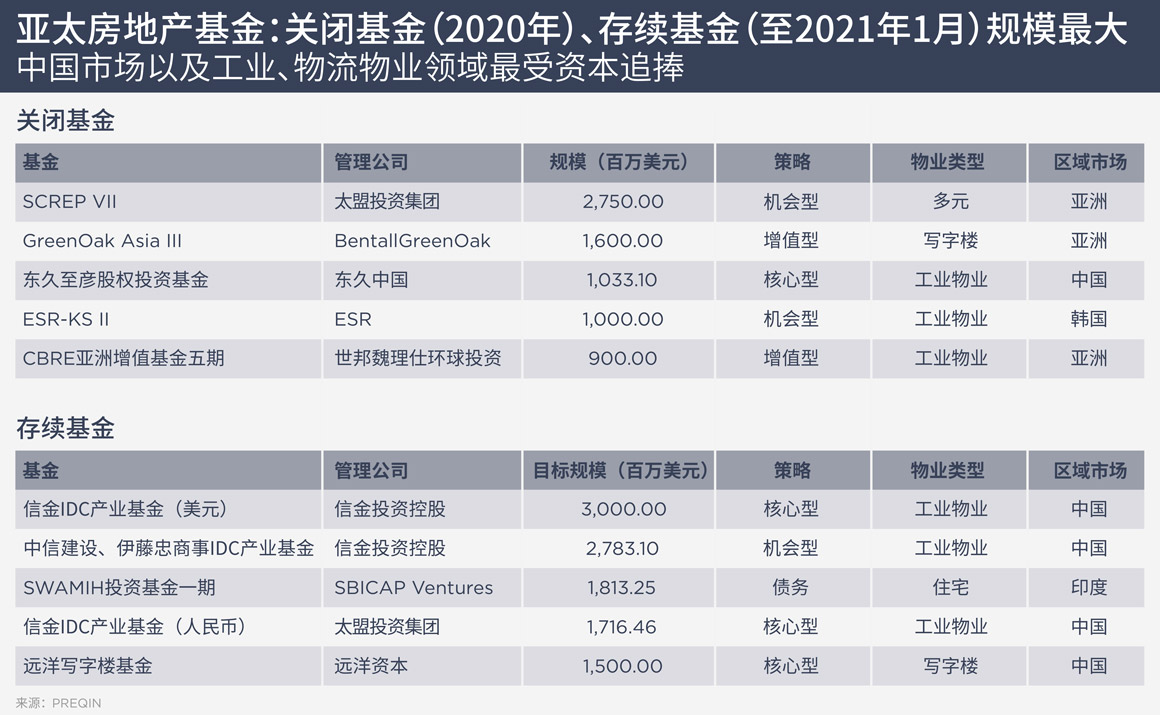 疫情期间,房地产私募股权基金的融资步伐仍在继续。据Preqin数据显示,亚太区最大的10支基金在2020年的募资总额超过100亿美元。截至2020年底,私募股权计划投向亚太房地产市场的资金储备达到404亿美元。